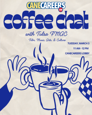 Join CaneCareers for a casual coffee chat with Tulsa FMAC and learn about careers in film, music, arts and culture. This informal conversation is a great opportunity to hear from professionals in creative industries, ask questions and explore how your interests can turn into career opportunities in Tulsa’s creative economy. Coffee provided.