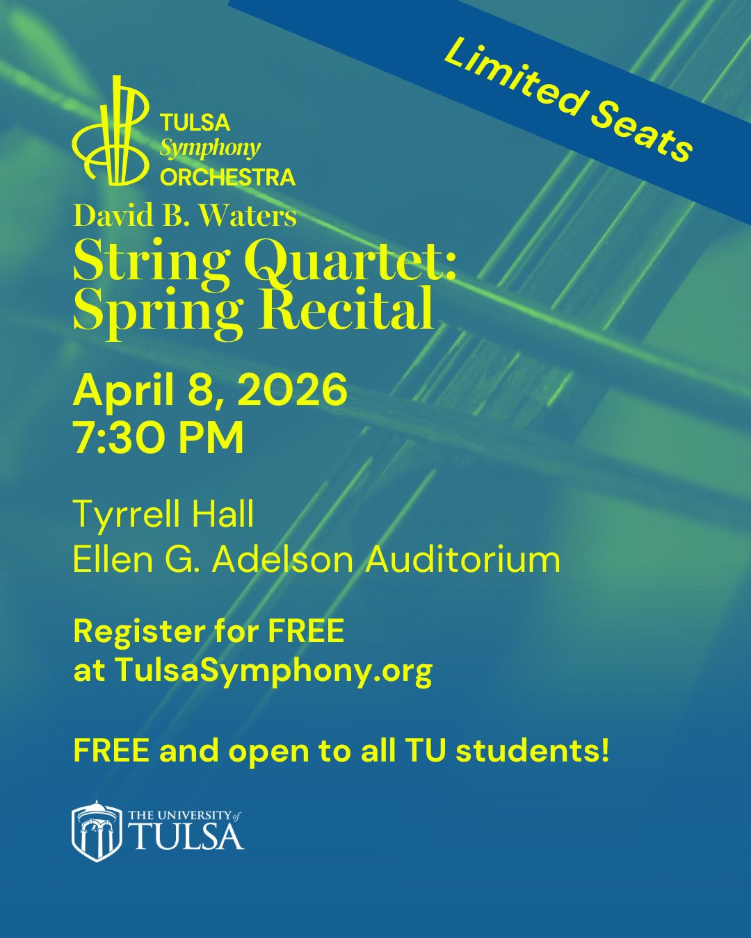 You are invited to attend the David B. Waters Trust String Quartet Recital on The University of Tulsa campus.