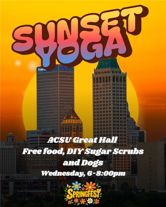 Come join the Student Activities Board in this years SpringFest event! We will be having 30 minute sessions of sunset yoga in the Great Hall inside the Student Union! Come for the yoga, stay for the FREE food, dogs and sugar scrub making! We moved inside due to rain the day before.